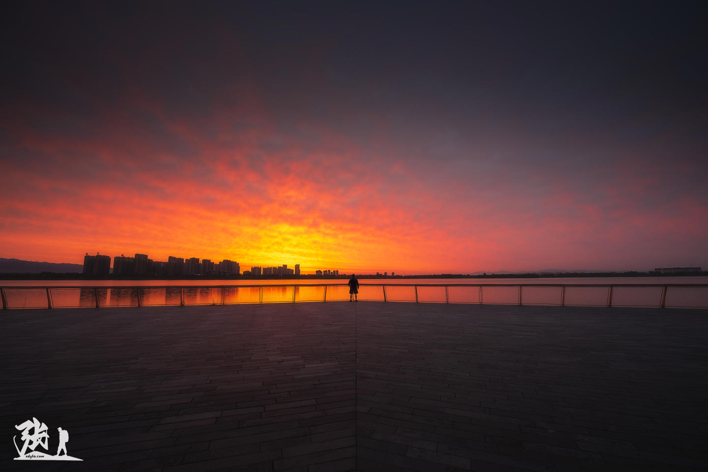 像桃心的树为前景,可这颗树的方位不在太阳升起的方向,霞光无法为它镀上理想的光晕,我只好重新选择机位,沿着河岸一路寻觅,最终找了一片宽阔的广场,让自己站在中心充当一个着眼点,镜头则稳稳对准东方的天际。