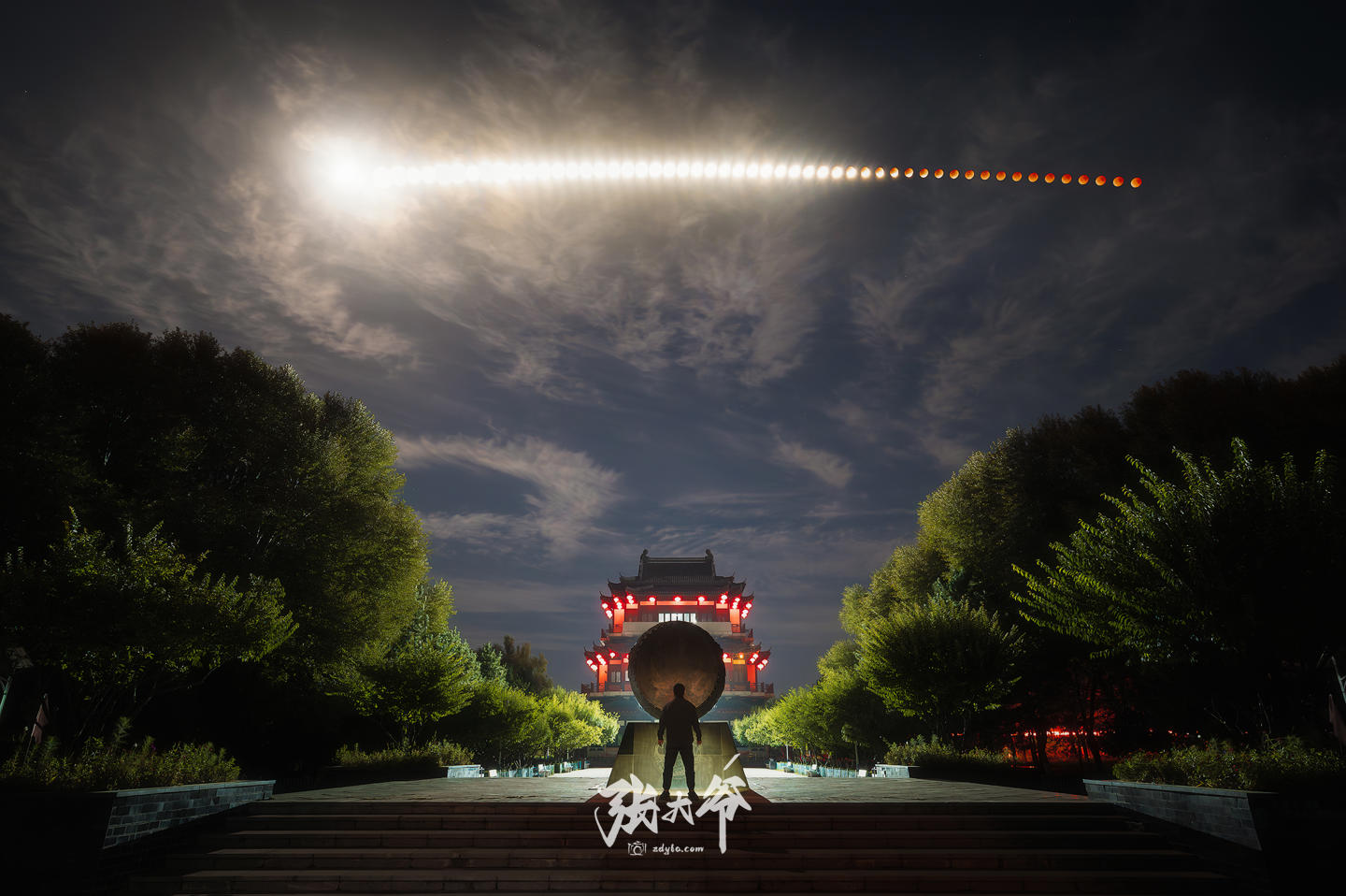 公园早已没了行人,只有相机快门的“咔嚓”声在寂静的夜里格外清晰。我时而站着观察月亮的变化,时而蹲身检查拍摄效果,累了就靠在三脚架上歇片刻,目光却始终没离开过天际的那轮圆月。从深冬般的寒夜到东方泛起鱼肚白,月亮从圆满到残缺,再从暗红的月核慢慢复圆,每一个阶段的模样都被我精心记录在镜头里。